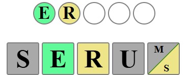 The letters on the side of each row represent letters found. Coloring of the letters found are based on the first time those letter appear. The position in the circle are not in target order. In this example, E is found in the correct position and R is incorrect position. E is not the first letter of the top word. Nor is R not possible to be in second letter of the target word.